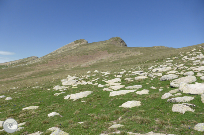 Enfront s'alça el vessant N dels pics d'Engorgs, que tanquen la capçalera de la vall de Campcardós passant per la portella Blanca d'Andorra, on conflueixen tres estats: Andorra, França i Espanya. La carena, que segueix cap a l'E, ja completament en territori francès, ens portaria fins als pics de Fontnegra. Nosaltres, però, girem a la dreta (O) i avancem per l'ampli llom carener, solell però ventat, on el camí es desdibuixa entre els claps d'herba.