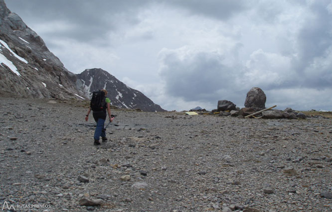 Després d'aproximadament 1:00h de camí, deixem enrere la base del Taillón i creuem les estribacions del seu contrafort NE. Immediatament encarem la pujada per un terreny agrest i creuem el curs d'aigua que ve de la glacera del Taillón.