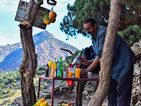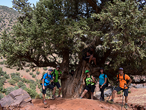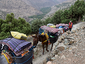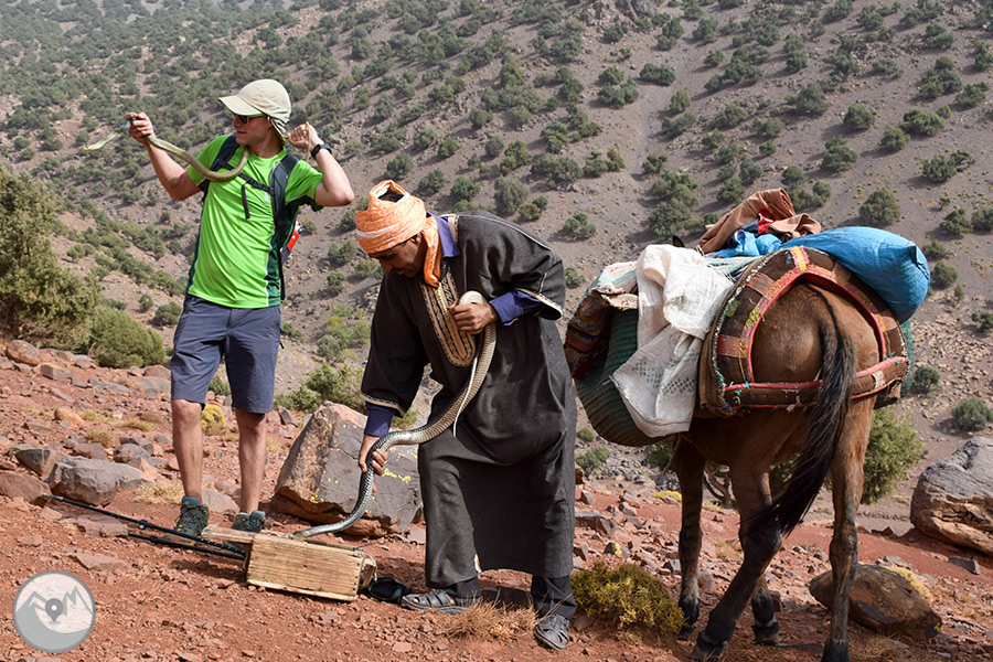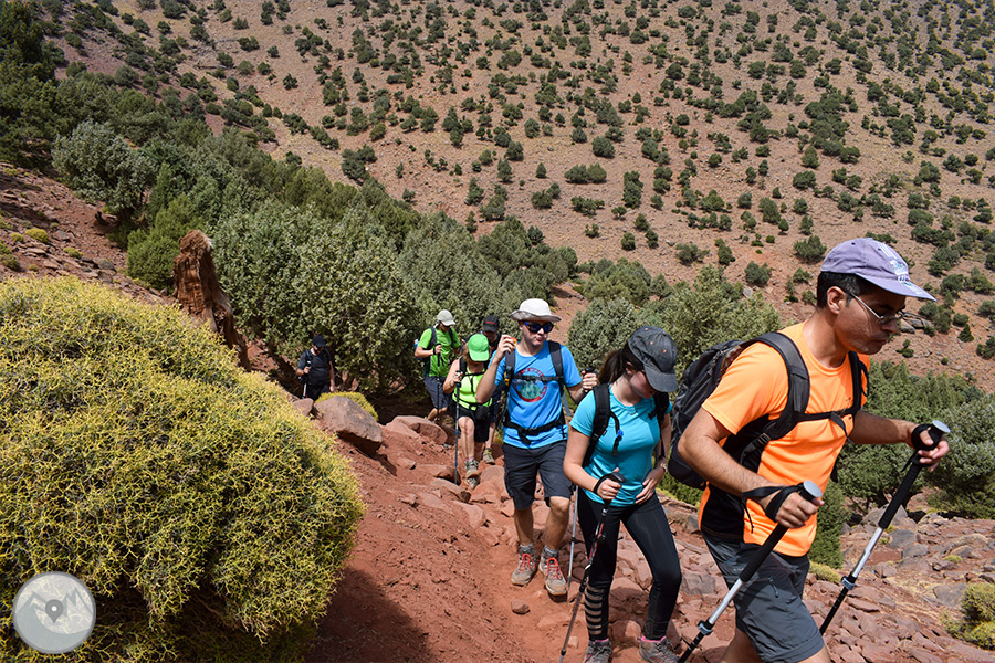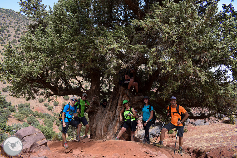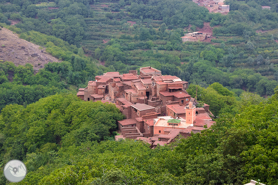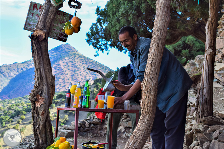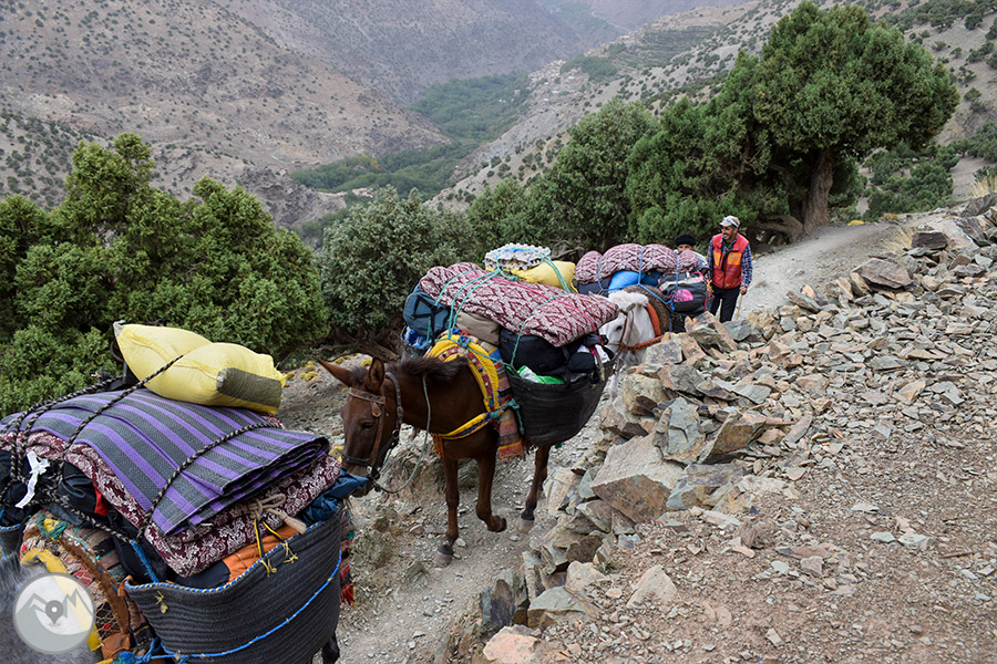 Sortida amb vehicle en direcció a l’Atles travessant diferents poblats fins al nucli d’Imlil, on ens trobarem amb el nostre guia local, mules i mulers, cuiner i punt d’inici del nostre trekking. Començarem a caminar per un camí costerut, contemplant magnífiques ginebres i sabines centenàries adaptades perfectament al rigor d’aquests paratges. Un cop superem el coll Tizi Oudite, entrarem a la bonica vall fèrtil d’Azzadene i ja divisarem el poblat de Tizi Oussem, on ens instal·larem en una acollidora casa berber.