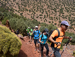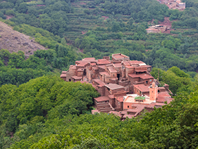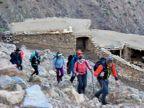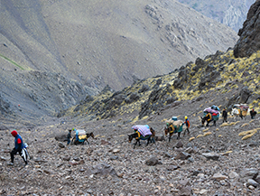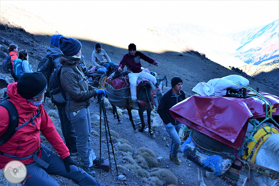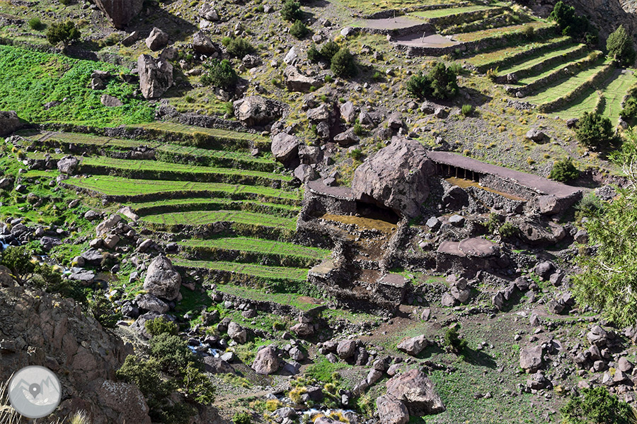 Avui remuntarem la vall d’Àzzadene observant al nostre pas el sistema de conreus per terrasses, molt característic d’aquestes valls de l’Alt Atles, visitarem les sorprenents cascades de Irhoulidene i després arribarem al refugi de Tazarhart, situat a 3.000m d’altitud, on passarem la nit i aprofitarem per fer una bona aclimatació.