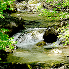 Seguim la carretera asfaltada en direcció E uns 800m i, en un revolt, prenem un corriol que baixa cap al riu de Sant Antoni. Seguim els senyals de pintura i, entre pastures i alzines, arribem a